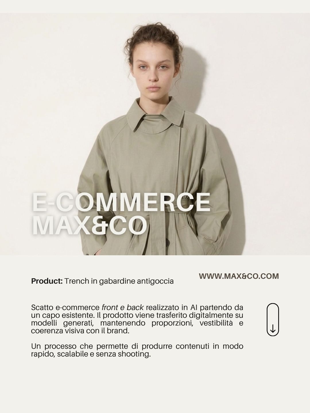 Questo capo Max&Co. è stato preso dal sito ufficiale e applicato su una modella AI. Front e back, pronti per e-commerce.